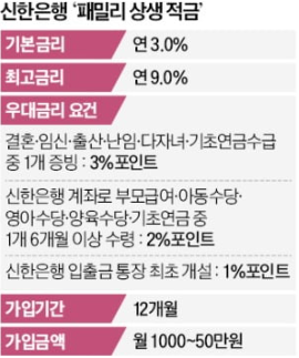 출처: 농협은행 신한은행은 지난해 '패밀리 상생 적금'을 출시했습니다. 기본금리 연3.0% 우대금리 최고 6.0% 포인트를 더해 연 9.0% 최고금리가 적용 가능합니다.